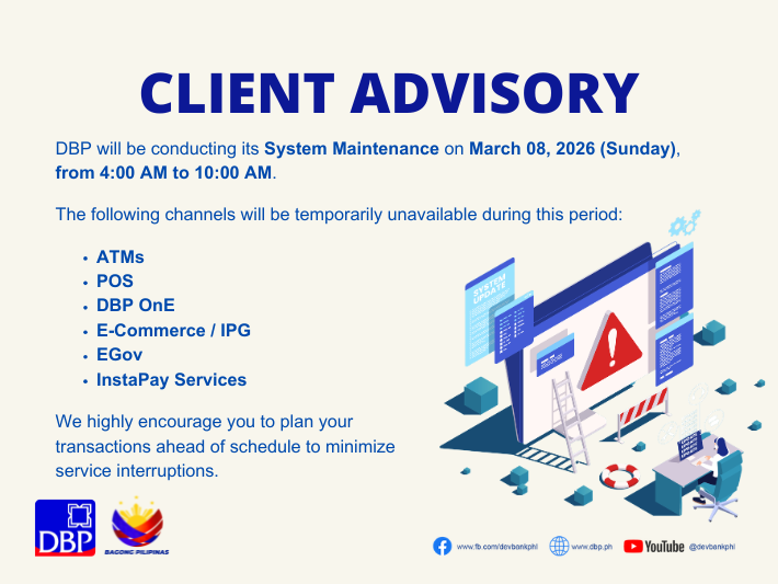 The Development Bank of the Philippines (DBP) is regulated by the Bangko Sentral ng Pilipinas (BSP). For inquiries and complaints, please visit your branch of account, email customerservice@dbp.ph, contact the BSP Financial Consumer Protection Department at telephone number (02) 708-7087, email consumeraffairs@bsp.gov.ph or access the BSP Customer Assistance Management System(CAMS) Chatbot by sending an SMS to 021582277 (for Globe subscibers only) or visiting the BSP Facebook Page.